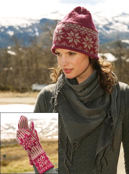 Mössan har en bred mönstrad bård som stickas efter diagram. Vantarna är varma och goa med klassiskt stjärnmönster.