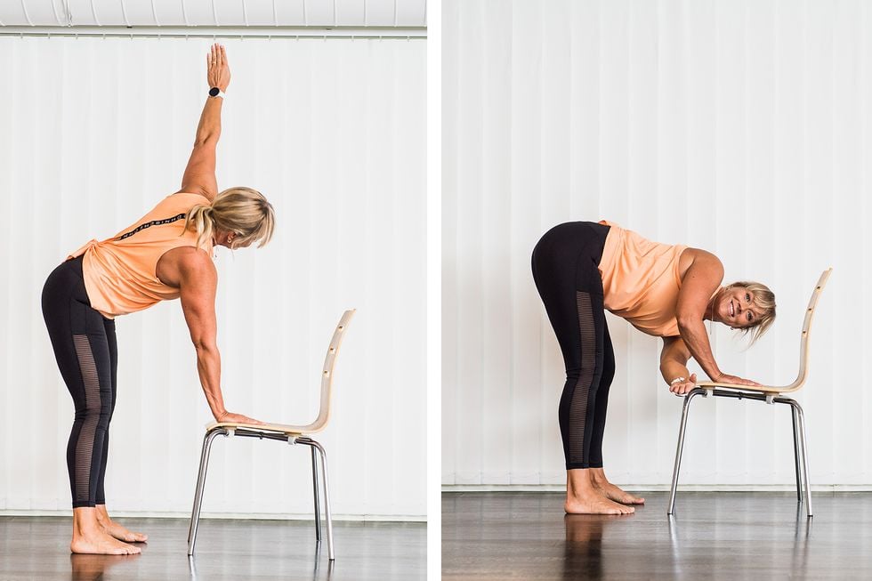 Lyft knäet, dra det åt sidan och rita en cirkel med knäet på sidan av kroppen. Ta stöd av en stol om du behöver. Gör rörelsen fem gånger och byt sedan till andra knäet. Om du vill utmana balansen och coremusklerna kan du prova att släppa stolen.
