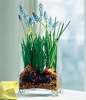 1. Två lådor pärlhyacint. I den låga, 8 x 16 cm med 8 cm hög kant, står de utslagna blommorna. Vasen kostar 90 kr hos Floristkompaniet. I den högre lådan har inte blommorna tittat upp ännu men bladverket är vackert, bara det. Vasen är 12 x 12 cm med 18 cm hög kant, 75 kr hos Åhléns.