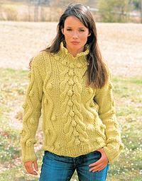 Framst: = 49-53-55-63-67 m. Maska av för ärmhål i varje sida på vartannat v: 2 m 0-1-1-2-2 ggr och 1 m 1-1-1-3-4 ggr = 47-47-49-49-51 m. När arb mäter ca 51 cm – avpassa efter en hel rapport på höjden med M 2 – stickas M 3 över de mittersta 45 m till färdigt mått (de övriga m stickas som innan, d v s aviga på rätsidan och räta på avigan). Samtidigt när arb mäter ca 52-53-54-56-58 cm – avpassa så att det är stickat minst 2-4 v efter en flätning mitt fram – maskas de mittersta 3 m av till hals. Fortsätt avm 1 m i varje sida mot halsen på varje v 11-11-12-12-12 ggr = 11-11-11-11-12 m kvar på varje axel. Fortsätt mönstret tills arb mäter 61-63-65-67-69 cm. Nu minskas det 1 m över de 3 slätst m på varje axel = 10-10-10-10-11 m, sedan maskas alla m av, arb mäter ca 62-64-66-68-70 cm.