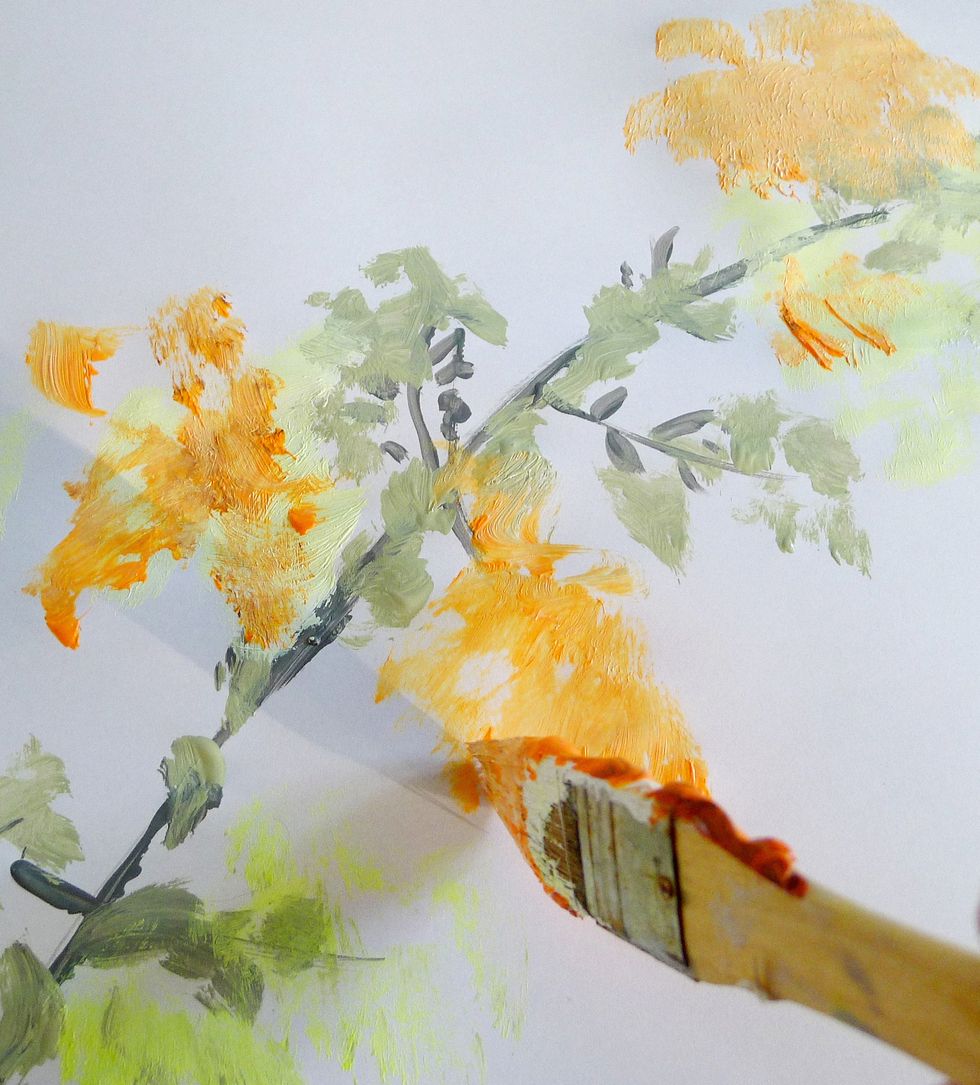 5. Blanda den neonorange färgen med vitt och dutta den ovanpå den gula, men också vid sidan om. Måla stora fläckar till blomhuvuden. De ska inte placeras alldeles intill rankan. Bestäm var mitten ska vara och måla utåt därifrån.