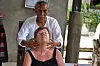 Healern ber henne sätta sig på golvet framför honom. Han håller om hennes huvud och trycker på olika punkter på hjässan och även i öronen.