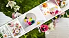 2. Vik ihop papperskvadraterna enligt steg 1–4 på skissen och klipp sedan formen av en blomma enligt steg 5–7.