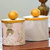 Två godisburkar med mjukt lock förvandlades enkelt med tapet, lite guldfärg och vaddkulor från hobbyaffären. Klipp ut kraftig kartong och limma på insida lock. Måla vaddkulorna och kanten av locket med hobbyfärg i guld, låt torka. Mät, klipp ut och limma fast tapet på lock och sidor. Limma fast vaddkulan på locket, använd hobbylim.