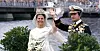 Och där kom de! Kungen i amiralsuniform, fröken Silvia Sommerlath i elfenbensvit klänning från Dior och drottning Josefinas kamédiadem och med en brudbukett bestående av orkidéer, doftrankor, liljekonvaljer och myrten.