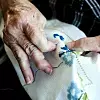 Ingrid har ett speciellt grepp som gör att hon kan brodera sina fina dukar, trots ledgångsreumatismen.