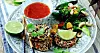 4. Forma smeten till 16 biffar och vänd dem i sesamfrö. Stek biffarna i en stekpanna med olja, ca 2 minuter per sida. Servera med sweet chilisås, wokade grönsaker och limeklyftor.