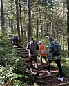 i långsamt gemak. Med Shigeyoshi Kumeda i täten börjar vi i ett avslappnat tempo röra oss in i skogen längs en noggrant utmärkt och välpreparerad led. Vi går längs en brusande flod där det flottades timmer förr i tiden.
