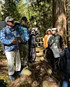 Idag är vi cirka 15 personer som står stampar friluftsklädda i den något köldslagna förmiddagssolen. Vi befinner oss i ett bergsområde med vidsträckta skogar mellan Kyoto och Tokyo, i Japan. Efter gårdagens regn är luften fräsch och himlen klarblå. Naturen känns nytvättad. Det doftar osedvanligt friskt av alla barrträd som omger oss.