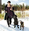 Nu är det dags för eftermiddagens promenad. Therese hämtar kopplen vid entrén och hundarna vet genast vad som är på gång och börjar otåligt röra på sig i sina boxar. Selma, Grappa och Therese egen nakenhund Cajsa får på sig sina koppel och följer ivrigt med ut i vårsolen och snöslasket.