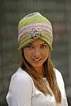 Afrodite heter mössan som har turbanform och en virkad blomma framtill.