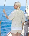 Garnåtgång: Sirdar Cotton Rich Aran (60% bomull, 40 % akryl, 100 g =200 m, 18 m och 24 v = 10 cm, stickor nr 5), vitt (01) 500-500-600-600-700-800 g.