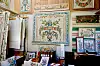 Det tar en stund att insupa allt, för det finns mycket att titta på. Moraklockor, dalaskåp, dörrar, träskyltar, travar av hopvikta linnedukar, burkar proppfyllda med penslar … Och, förstås, kurbitsmålningar på längden och tvären.