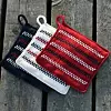 Varv 2: Virka 1 fm i varje fm, 2 fm i varje hörn. Virka ca 30–35 fm om upphängningsöglan, fortsätt att virka fm tills du kommer till grytlappens nedre högra hörn, avsluta med 1 sm.