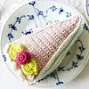 Det är väldigt populärt att virka små bakverk till prydnad. Här får du beskrivningen till en riktigt söt tårtbit med marsipanrosen på plats, allt virkat i bomullsgarn.