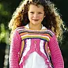 Volang nertill på ärmen: Varv 1, rosa: Virka 1 st i varje st på första varvet på ärmen. Vänd. Varv 2, gult: Fäst tråden med 1 sm, 3 lm (= 1 st), virka i samma m (2 st, 1 lm, 2 st), 1 lm, *hoppa över 2 m, i nästa m virkas (2 st, 1 lm, 2 st)*. Upprepa från * - * hela varvet. Sluta med (2 st, 1 lm, 2 st) i sista m. Vänd. Varv 3, grönt: 4 lm (= 1 dst), 1 dst i samma m (som 4 lm), * virka 2 dst i varje lmb hela varvet. Sluta med 2 dst i sista st. Vänd. Varv 4, lila: Fäst tråden med 1 sm, 3 lm (= 1 st). Virka 1 st i varje dst hela varvet. Vänd. Varv 5, vitt: Fäst tråden med 1 sm, 3 lm (= 1 st). *Hoppa över 1 st, i nästa st virkas 3 st*. Upprepa från * - * hela varvet. Sluta med 1 st i sista st. Varv 6, rosa: Fäst tråden med 1 sm, 3 lm (= 1 st), 1 st i samma m, *hoppa över 3-st-gruppen, virka 3 st*. Upprepa från * - * hela varvet. Sluta med 2 st i sista st. Varv 7, rosa: Virka som varv 6. Varv 8, lila tråd + paljetter på tråd: Fäst tråden med 1 sm, 3 lm (= 1 st). Virka 1 st i varje st hela varvet. Varv 9, gult: Fäst tråden med 1 sm, 3 lm (= 1 st). Virka 1 st i varje st hela varvet. Virka den andra ärmen på samma sätt. Montering: Sy ihop ärmarna och sy i dem. Dekorera med en fin knapp eller pärlor mitt fram.