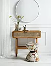 Skir textil i kombination med det fina sidobordet i meshvävd rotting och teak från Nordal ger hallen ett lyft. Addera gärna torkade blommor för rätt känsla.