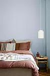 Blå toner sovrummet är både lugnande och vackert för ögat. Satsa på sängkläder, möbler och detaljer i en färgskala som bryter av. Här har rummet fått en modernt bohemisk touch med hjälp av mönstrade kuddar, filtar och sängbord i rotting.