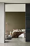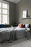 En dämpad färgskala med få utvalda detaljer i färg skapar en både rofylld och intressant inredning i sovrummet.