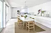 Köken ska inte längre se ut som kök utan de får gärna kännas som vanliga rum och de dekoreras därefter. Kök från Lundins Kök med luckan "Lobo" och extra låg sockel. Alla skåp är handtagslösa, carraramarmor används till bänkskivor och stänkskydd.