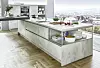 Noblessas kök "Riva" hakar på vurmen för betong. Betong förmedlar råhet och kyla samtidigt som den i rätt miljö upplevs som varm och naturlig. Lägg också märke till hyllplanet under köksön – en läcker designdetalj.