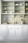 Överskåp utan dörrar med en hylla under och väggar klädda i pärlspont, samt innanför- liggande luckor med synliga gångjärn, ger en atmosfär som påminner om stilen kring sekelskiftet 1900. Köket "Broby" från Kvänum i handmålad ask är tidlöst vackert.