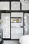Klä in badkaret i marmor och låt samma sten fortsätta i golvet – det skapar en hotellyxig look. Breda kanter runt karet ger utrymme för schampo­flaskor. I stället för fasta väggar har badrummet skilts av med glasförsedda skjut­dörrar i art déco-stil. Inredningen står norska Alexandra Hegard för.