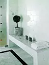 Marmor tillför glamour till badrummet. Vit marmor kan vara randig, flammönstrad, fläckig eller ådrig – så det är lätt att hitta sin egen favorit. Här har vit, grå och svart marmor från Tulikivi satts samman till en stilig helhet.