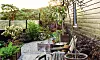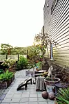 Med en varm pläd och en kopp te blir uteplatsen ett extra rum året om. Vid staketet en syrenhortensia, vars blommor får en rosa färgton på hösten.