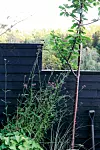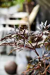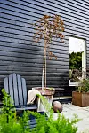 Aina skapar höjd på uteplatsen med uppstammade buskar och träd. Blodbok trivs i en stor frostsäker kruka.