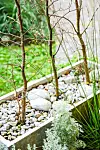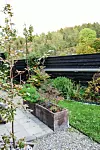 Flera bokträd tillsammans i stora avlånga lådor kan fungera som en spännande rumsavdelare i en liten trädgård. Om man täcker med sten får man en vacker kontrast.