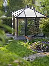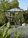 Växthuset har Ulf byggt själv för att få den kvadratiska formen. Det krattade gruset symboliserar ringar på vattnet kring de tre stenarna.