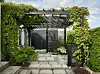 Pergolan på framsidan är byggd i smala ribbor och får karaktär av vildvinet som slingrar upp och ger skugga.