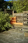 I den stora terrassen har Ulf byggt in en bänk i kvällssolen. Bambun ger en asiatisk touch.