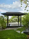 Eftersom det är kvällssol på motsatt sida om huset har Ulf byggt en fem meter bred terrass här i tre olika nivåer, omgiven av grönskande bambu. Det här är trädgårdens relaxavdelning med en nedsänkt jacuzzi som är uppvärmd och används året runt. Här har man perfekt utsikt över den asiatiska paviljongen, man hör suset från gräs och bambu och det svaga ljudet av porlande vatten.