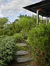 Gruset ger en känsla av vatten och krattas bara en gång per år. Zebragräs och hakonegräs ger ett ljud åt trädgården som gör att man kommer till ro.