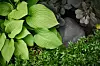 Ulf väljer stenen först och växterna efteråt för att de ska passa ihop. Funkia, perukbuske solvända. Den runda stenen är medtagen från Öland.