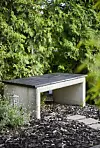 Paviljongen är omgiven av vintergrön bambu. På andra sidan gruset skymtar växthuset.
