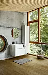Att hänga upp tvättställ och skåp på väggen är både funktionellt och vackert. Det gör sig väldigt bra i avskalade nutida miljöer.  Serien "Senti" från Kvik har en stram och enkel stil där luckorna öppnas med ett lätt tryck.