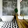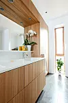 Låt badrumsskåpet ta plats och följa hela väggen. Om du väljer trä och oljar in det i en varm ton ger det en fin kontrast till svartvit klinker och en putsad betongvägg. Ett fint exempel från den australiska arkitektbyrån Auhaus.