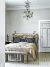 En textilklädd sänggavel, en sängkappa i linne och massor av kuddar gör denna sovplats extra inbjudande. Antikviteter tillför en speciell känsla till sovrummet. Bänken i betong kommer från brittiska Dragonstone.