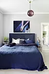Blått är flott. Sänggavel, sängkläder och kuddar – allt i snygga nyanser av blått och indigo. I detta färgmatchande sovrum hänger taklampan "Ballroom" från Design by Us. Sängkläder från Dirty Linen.