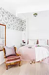 Fräscht sovrum med en svagt mönstrad tapet som ger lugn och liv på samma gång. Taklampa "Eos" från Vita Copenhagen. Överkast, Day Home.