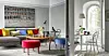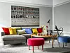 De färgglada kuddarna från Oscar & Clothilde är en gladlynt kontrast I det sobra vardagsrummet. I förgrunden står två av Evas plyschklädda puffar ”Eddy”. Soffbord ”2139” av Josef Frank, Svenskt Tenn. I hörnet står bordet ”Oolong” som Eva har gjort för Svenskt Tenn.