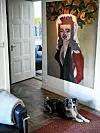 I hallen ligger australiska vallhunden Skipper och håller koll på grannarna. Målning av Cecilia Sikström.