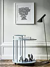Serveringsvagnen ”Julia”, har Eva formgett för NC Nordic Care. Bredvid står lampan ”AJ” av Arne Jacobsen.