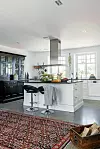I villan samsas mjukt med hårt för en både ombonad och avskalad känsla. Stora ytor med slipade stengolv och persiska mattor i värmande färger, spröjsade fönster med skira gardiner och platsbyggda skåp och bänkar med gedigen klang.