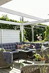 På den vindskyddade uteplatsen på baksidan finns rum för många. Grovt vävda kelimkuddar, linnepläd och keramikkrus ger en rustik känsla.
