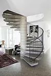 I husets centrum tronar hemmets utropstecken, den snygga spiraltrappan som egentligen är en källartrappa från Prefab.