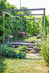 I ett hörn av trädgården står en rottingfåtölj intill familjens ljugarbänk av grova stenblock, där bok, funkia och suckulenter prunkar.